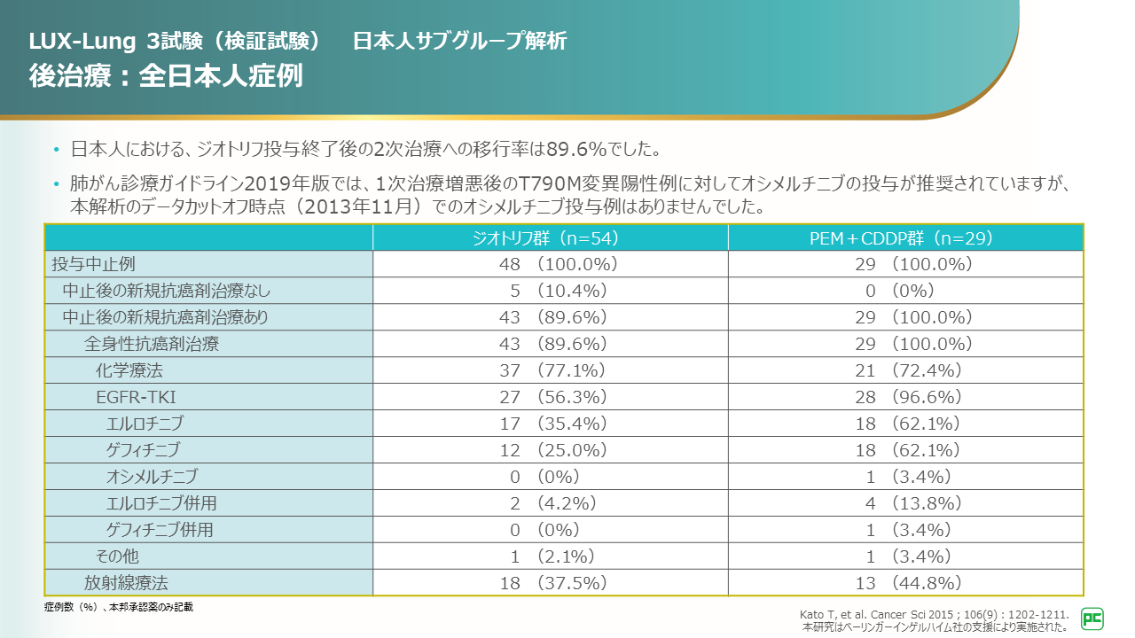 ジオトリフ投与終了後の2次治療への移行率は89.6%でした。後治療内容と治療別の割合はご覧の通りです。なお、本解析のデータカットオフ時点において、オシメルチニブ投与例はありませんでした。