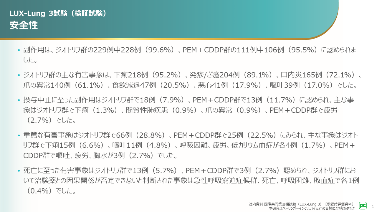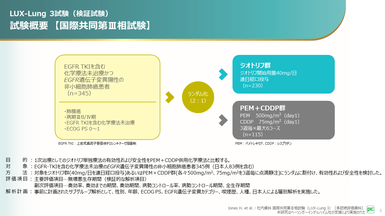本試験では、EGFR遺伝子変異陽性非小細胞肺癌を対象に、1次治療におけるジオトリフ単独療法とPEM+CDDP併用化学療法の有効性と安全性が検討されました。