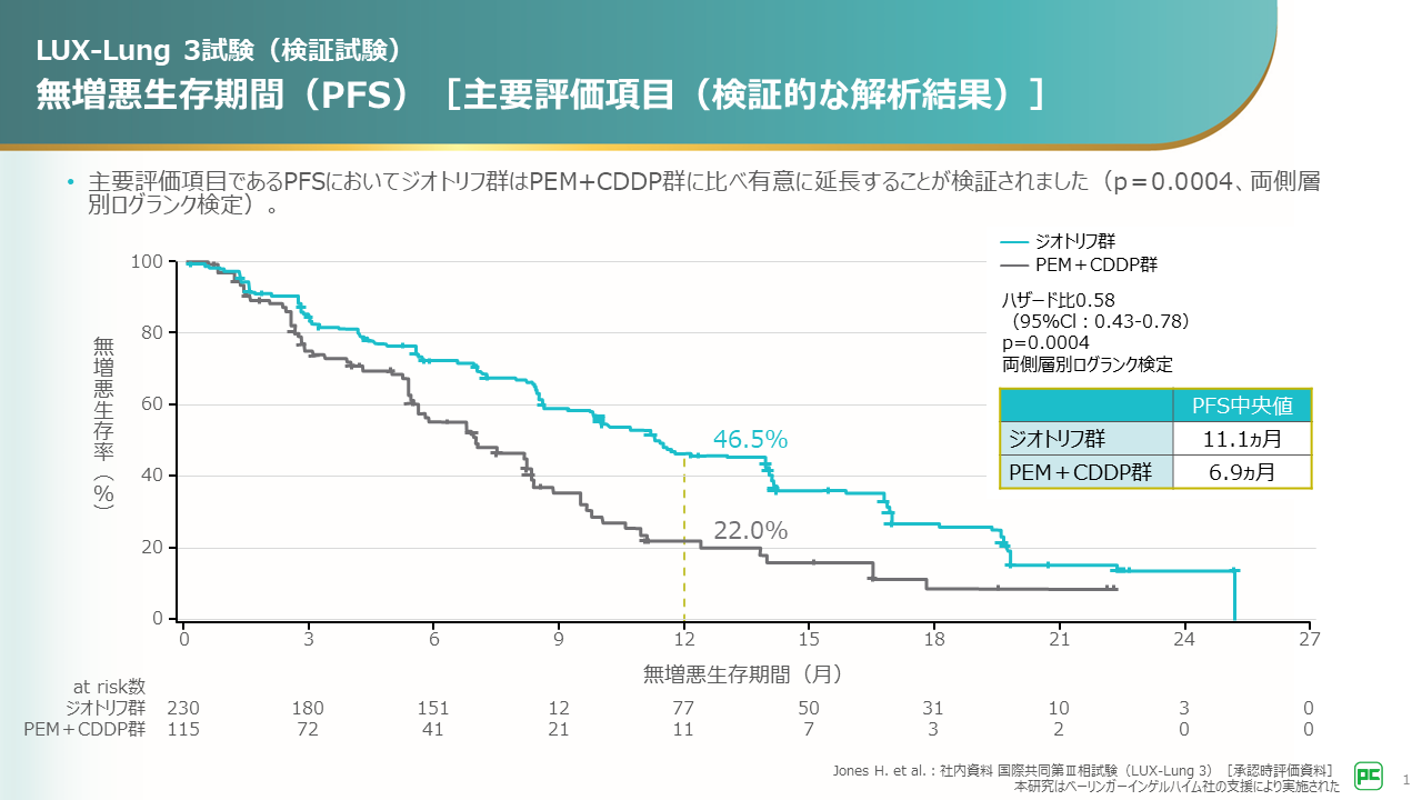 主要評価項目である無増悪生存期間(PFS)の中央値は、ジオトリフ群11.1ヵ月、PEM+CDDP群6.9ヵ月であり、ジオトリフ投与によるPFSの有意な延長が検証されました(p=0.0004、両側層別ログランク検定)。