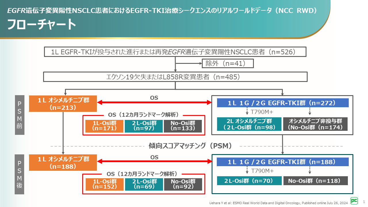 EGFR遺伝子変異陽性NSCLC患者における1次治療(1L)としての第一/第二世代(1G/2G)EGFR-TKIとオシメルチニブの実臨床での治療成績が評価され、後ろ向き研究の潜在的選択バイアスを最小化するために傾向スコアマッチング(PSM)が行われました。