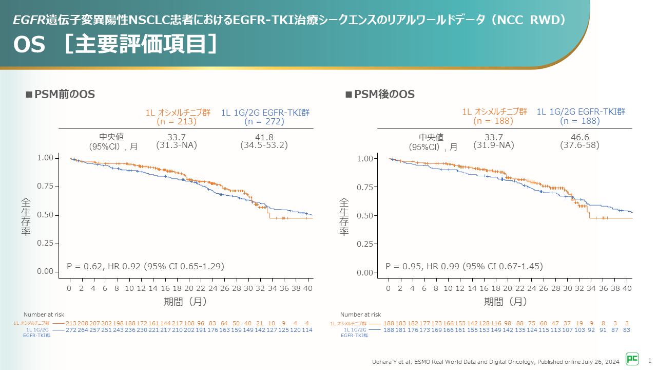 PSM後のOS中央値は、1L オシメルチニブ群は33.7ヵ月、1L 1G/2G EGFR-TKI群は46.6ヵ月で、両群間に有意差はみとめられませんでした[ログランク検定;名目上のp=0.95、HR 0.99(95%CI 0.67-1.45)]。