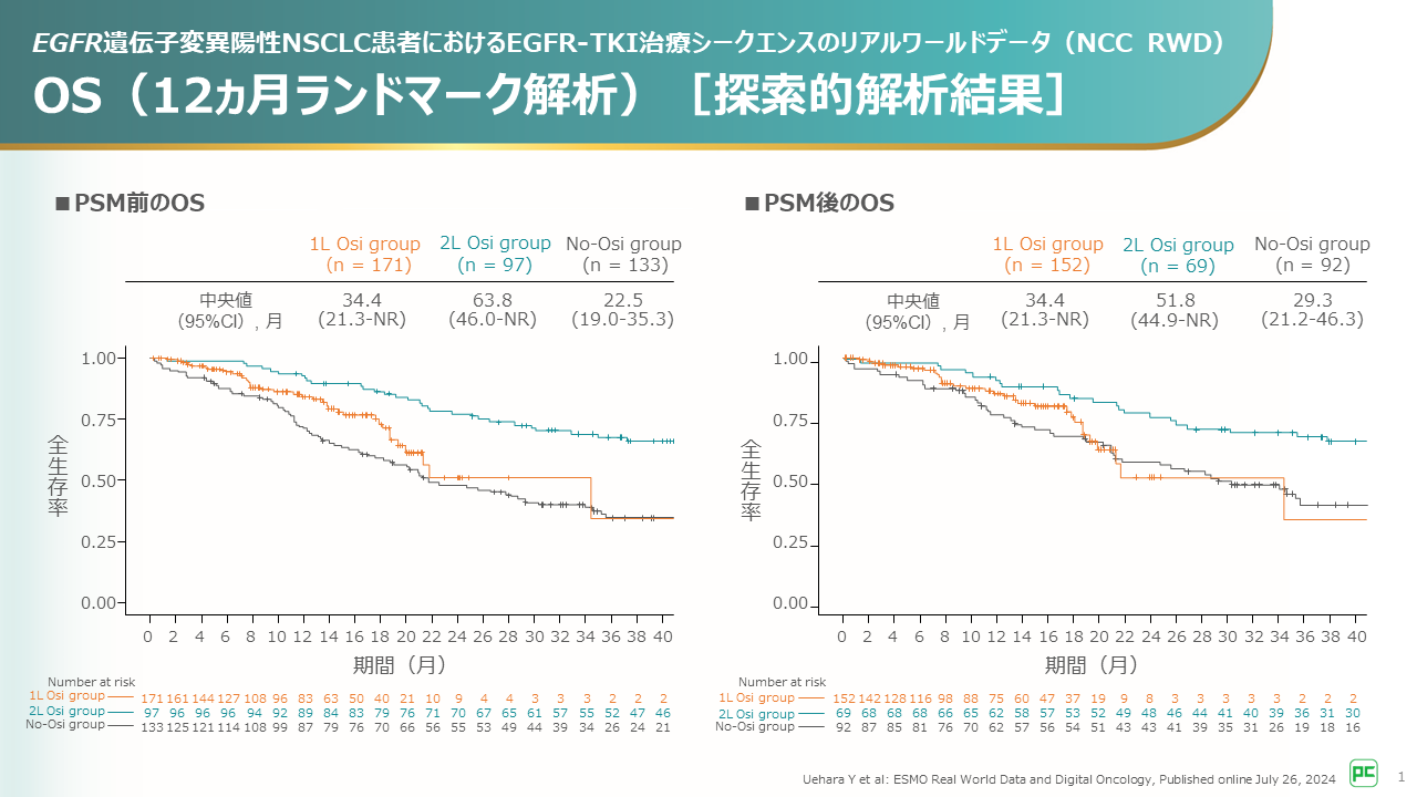 また、PSM後の12ヵ月ランドマーク解析によるOS中央値は1L-Osiで34.4ヵ月、2L-Osiで51.8ヵ月、No-Osiで29.3ヵ月でした。