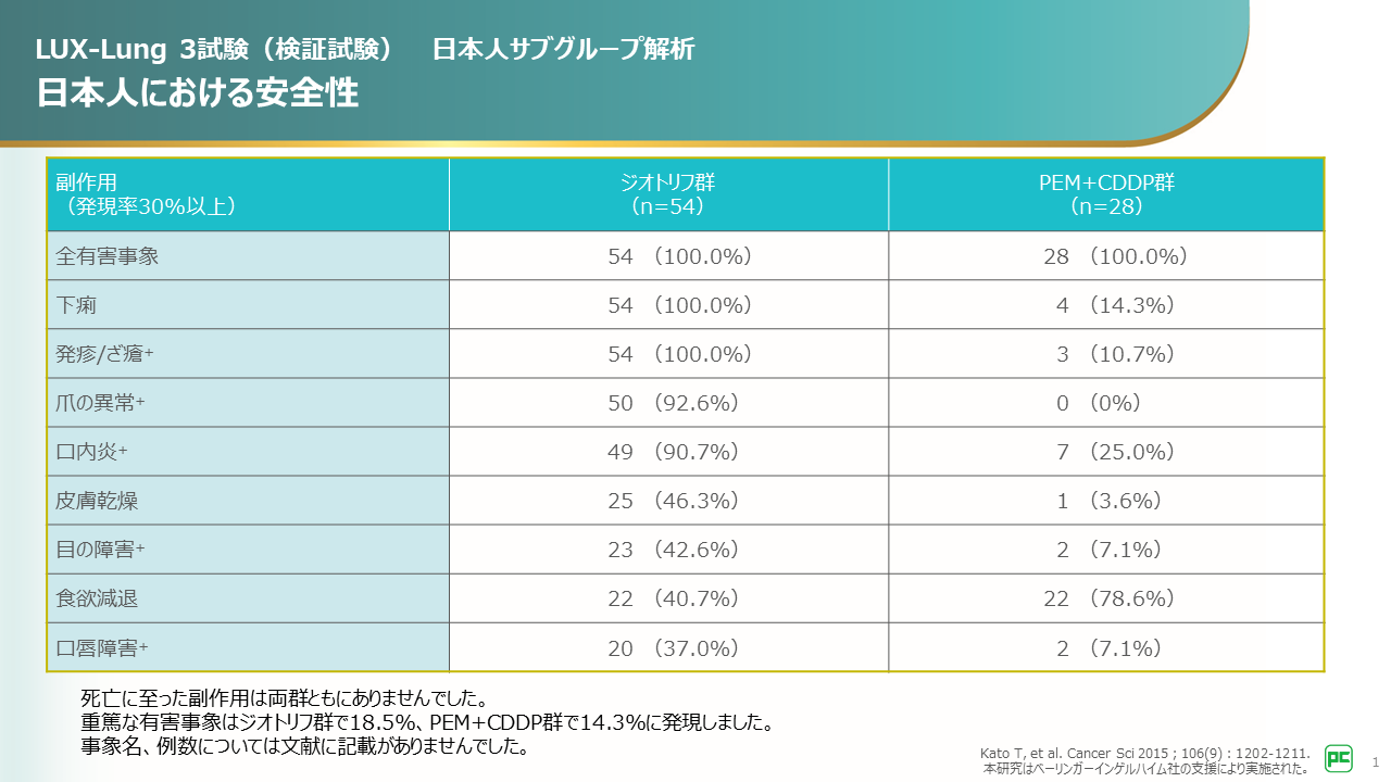 副作用による死亡例はジオトリフ群で4例[呼吸不全2例、敗血症1例、不明1例]でした。