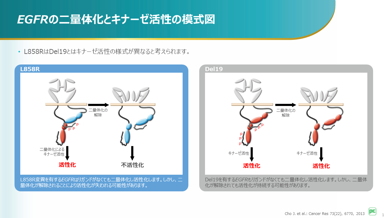一方、L858Rを有するEGFR変異体は、同じくリガンドなしに二量体化しますが、活性は二量体化に依存しており、単量体では活性をもたないと考えられています。(図1)