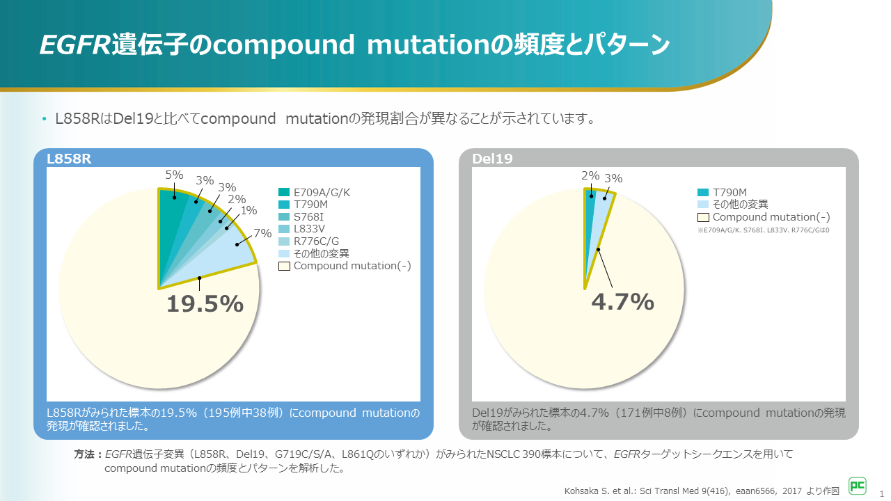 Compound mutationは、EGFR-TKI未治療でEGFR遺伝子変異陽性の肺腺癌患者61例を対象とした解析において、Single mutationに比べて予後不良であると報告されています。