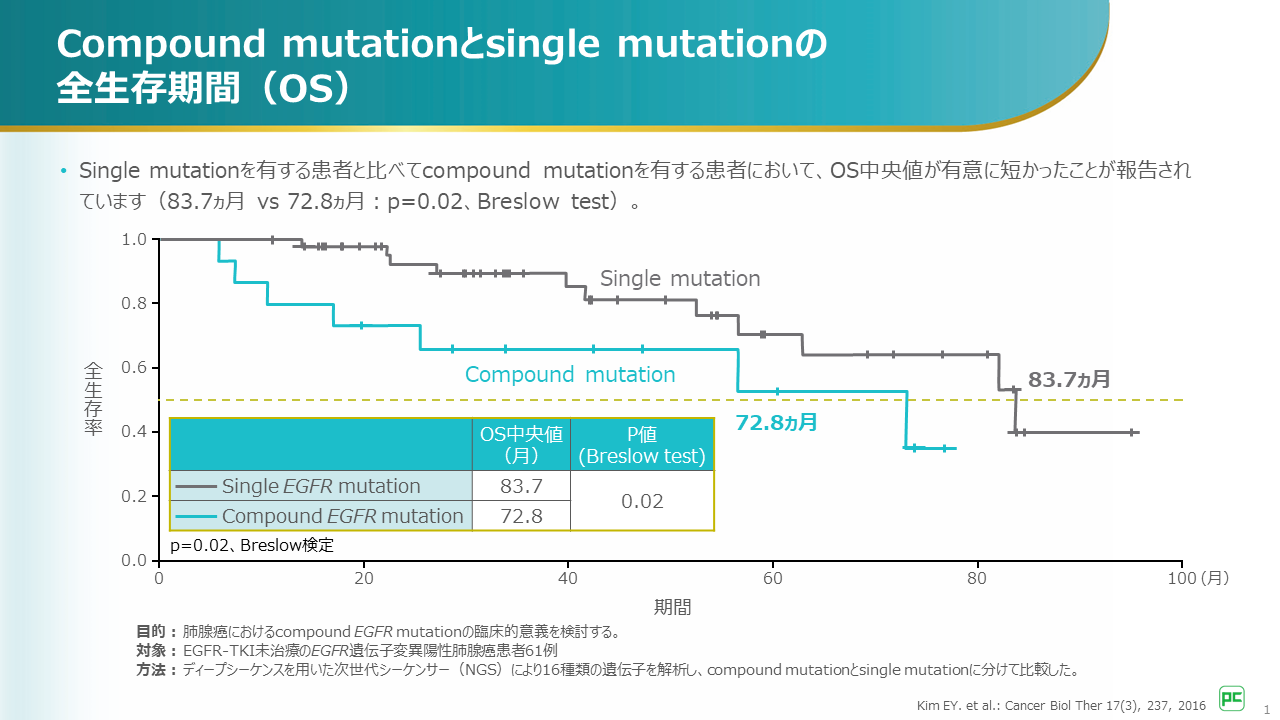 本解析における全生存期間(OS)の中央値は、 Single EGFR mutation群では 83.7ヵ月であったのに対し、 Compound EGFR mutation群では 72.8ヵ月であり、有意に短い結果でした。