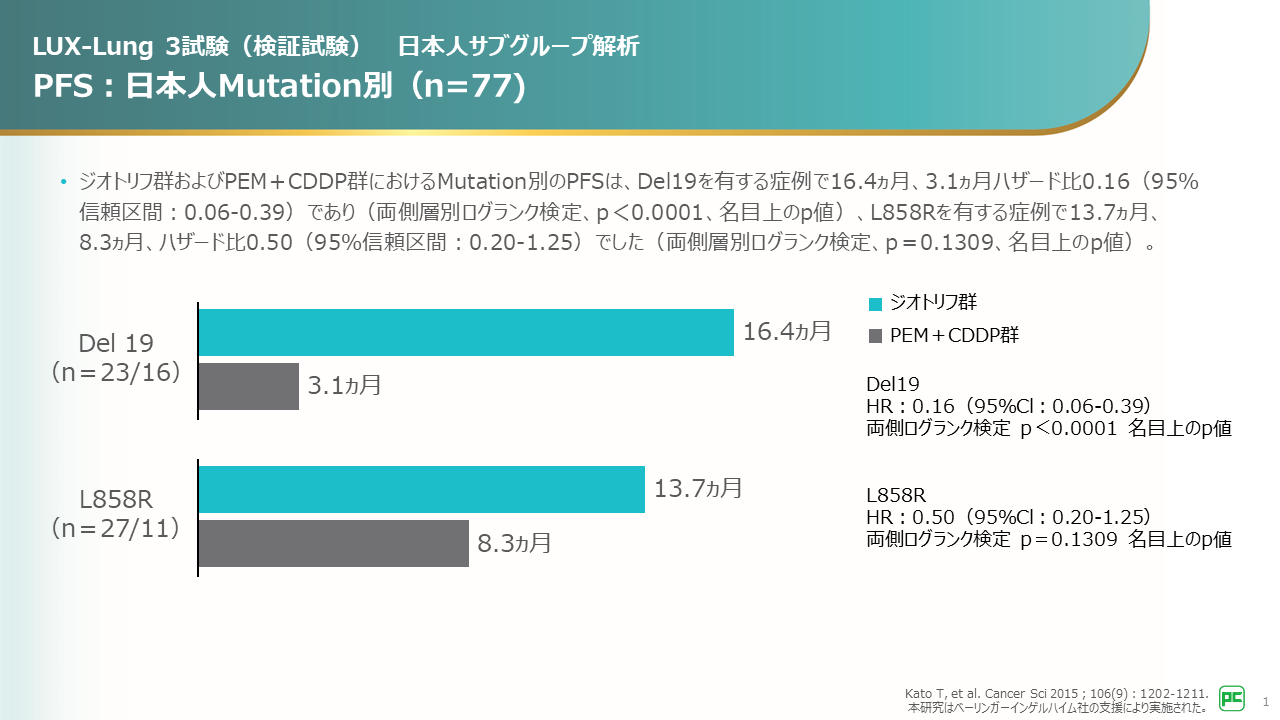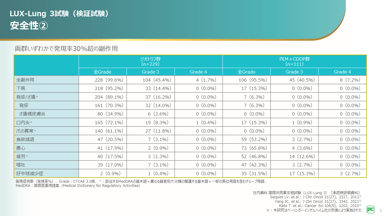 ジオトリフは、EGFR-TKIを含む化学療法未治療のEGFR遺伝子変異陽性NSCLC患者345例を対象に、国際共同第Ⅲ相臨床試験LUX-Lung 3試験が行われました。本試験の対象症例345例には、日本人83例が含まれていました。