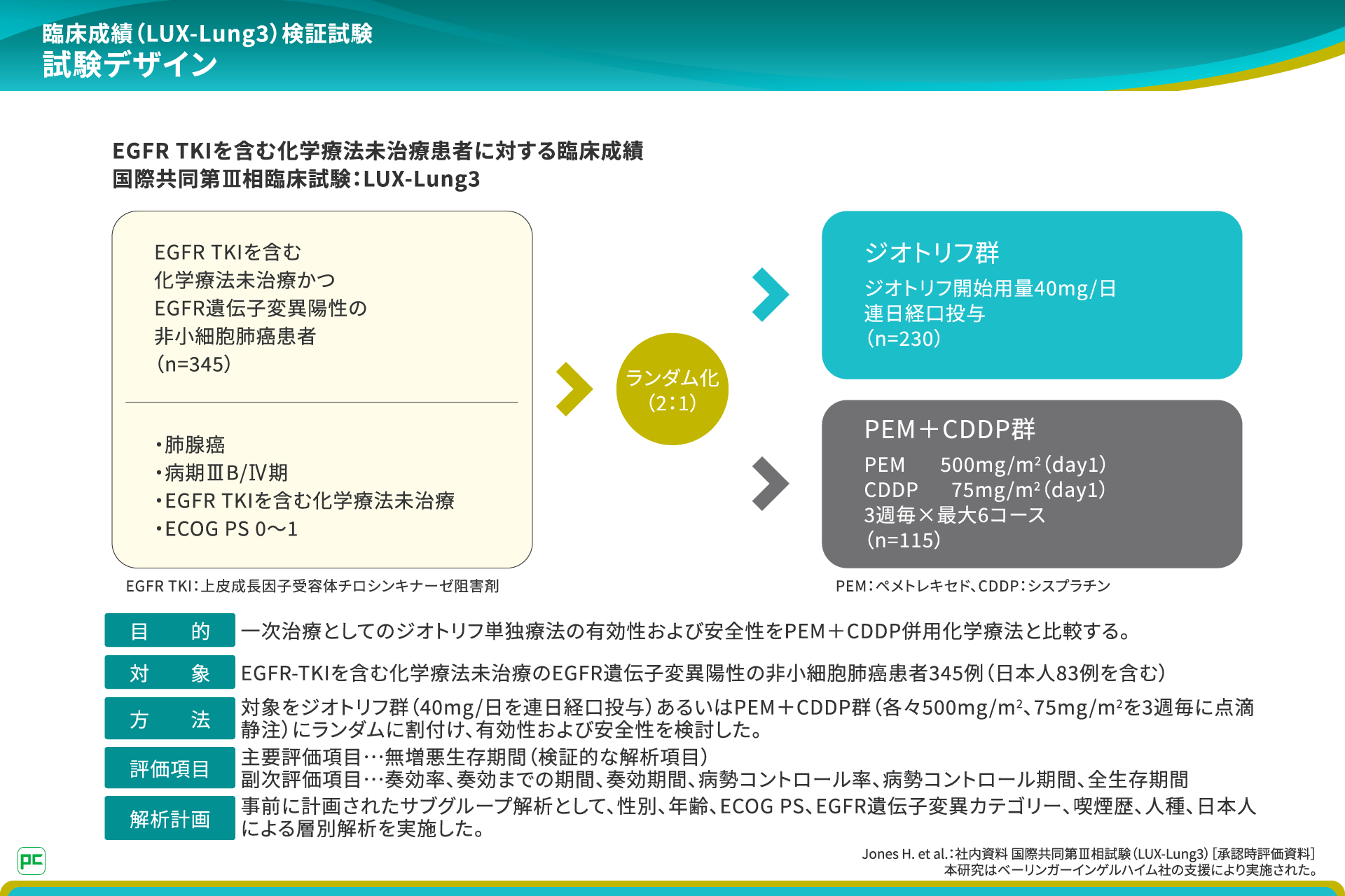 ジオトリフの国際多施設共同第Ⅲ相試験であるLUX-Lung3試験では、EGFR遺伝子変異陽性非小細胞肺癌の一次治療におけるジオトリフ単独投与とPEM+CDDP(ペメトレキセド+シスプラチン)併用化学療法の有効性の比較検討と安全性が検討されました。