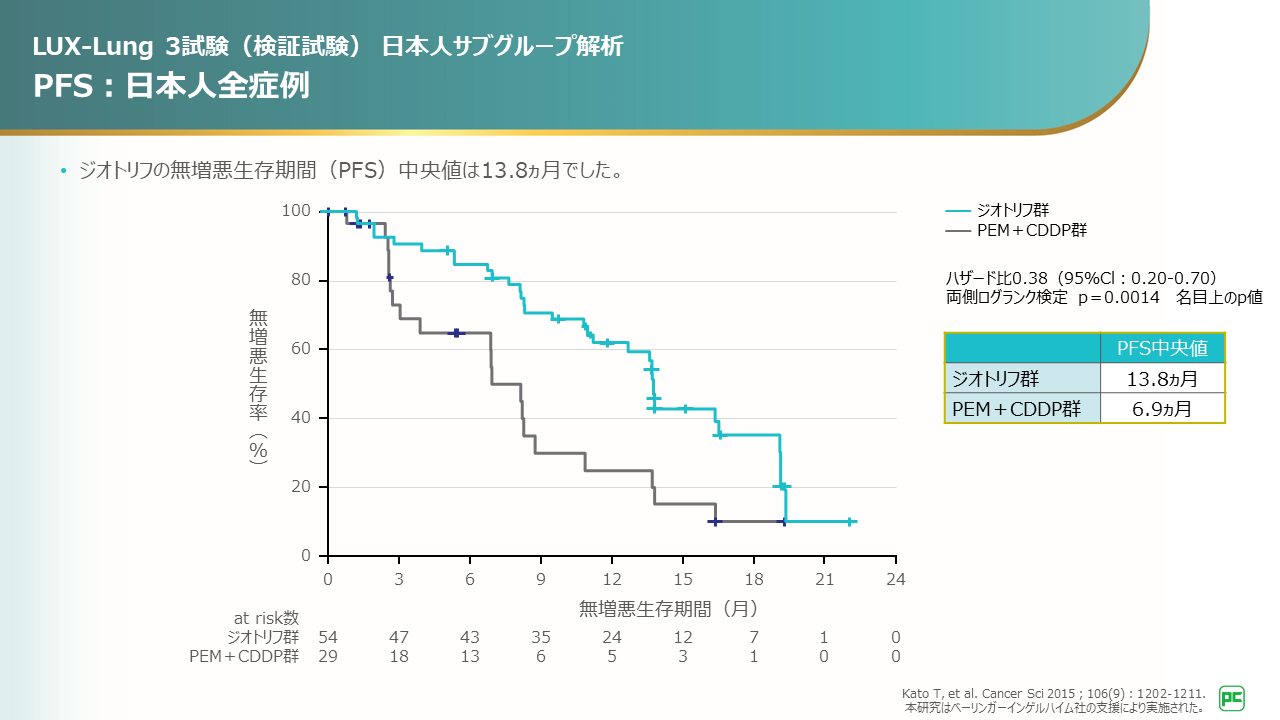 次に、日本人サブグループ解析2)では、PFS中央値はジオトリフ群13.8ヵ月、PEM+CDDP群6.9ヵ月であり、ジオトリフ投与による有意な延長が示されました(p=0.0014、両側ログランク検定、名目上のp値)。