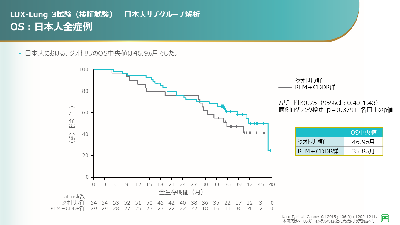 日本人サブグループ解析におけるOS中央値は、ジオトリフ群46.9ヵ月、PEM+CDDP群35.8ヵ月でした。