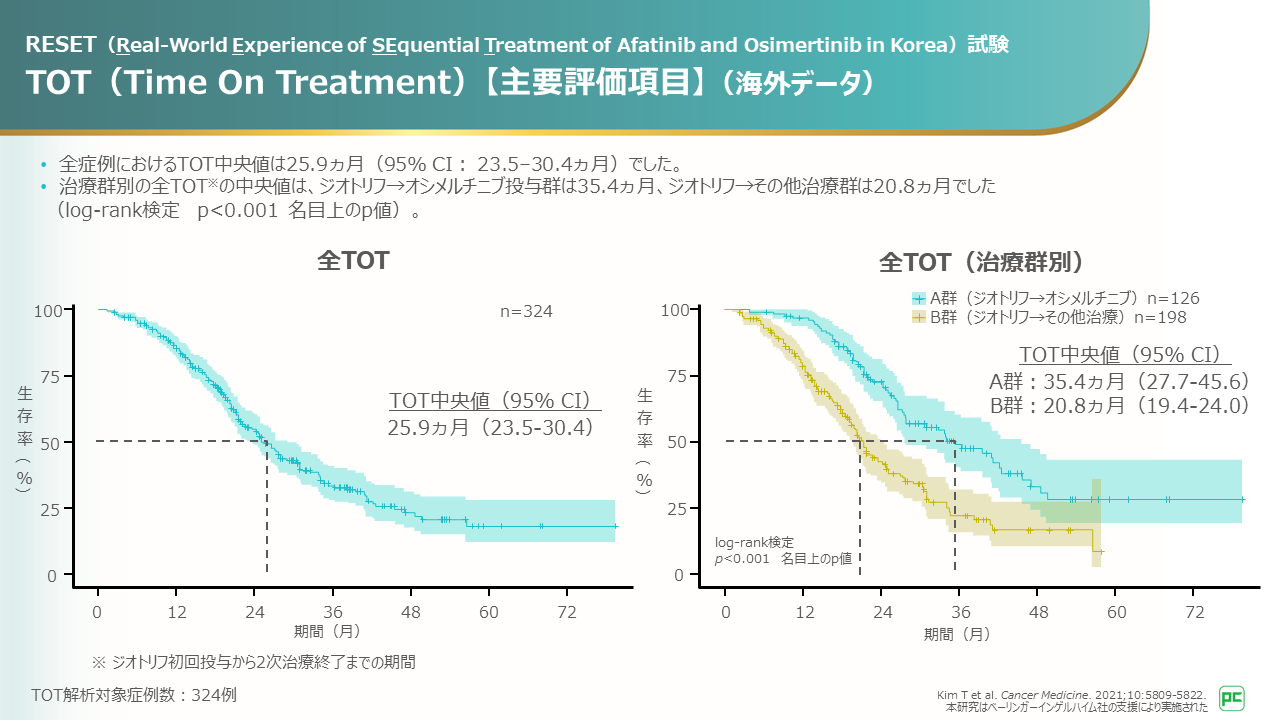 主要評価項目であるTime on Treatment(TOT)の中央値4)は、全症例で25.9ヵ月であり、ジオトリフ→オシメルチニブ投与群では35.4ヵ月、ジオトリフ→その他治療群では20.8ヵ月でした(p<0.001、log-rank検定、名目上のp値)。