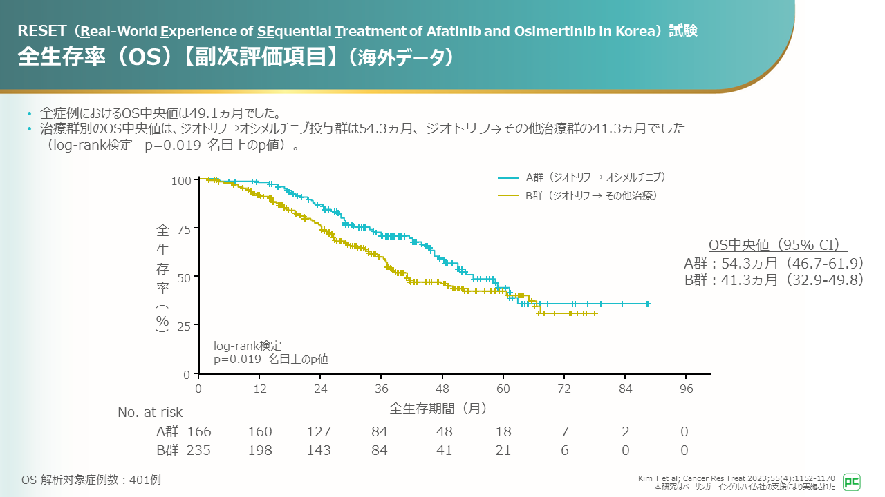 OS中央値は、全症例で49.1ヵ月であり、ジオトリフ→オシメルチニブ投与群では54.3ヵ月、ジオトリフ→その他治療群では41.3ヵ月でした(p=0.019、log-rank検定、名目上のp値)。