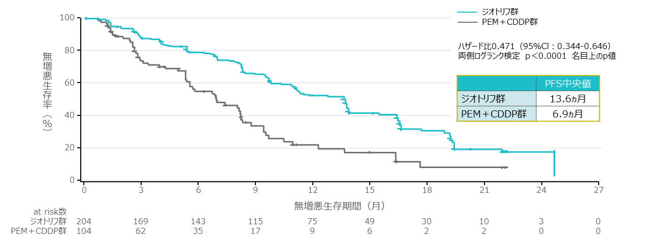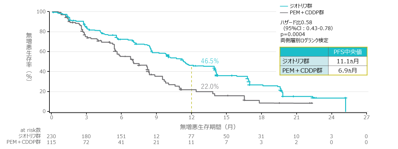 - 主要評価項目であるPFSにおいてジオトリフ群はPEM+CDDP群に比べ有意に延長することが検証されました(p=0.0004、両側層別ログランク検定)。