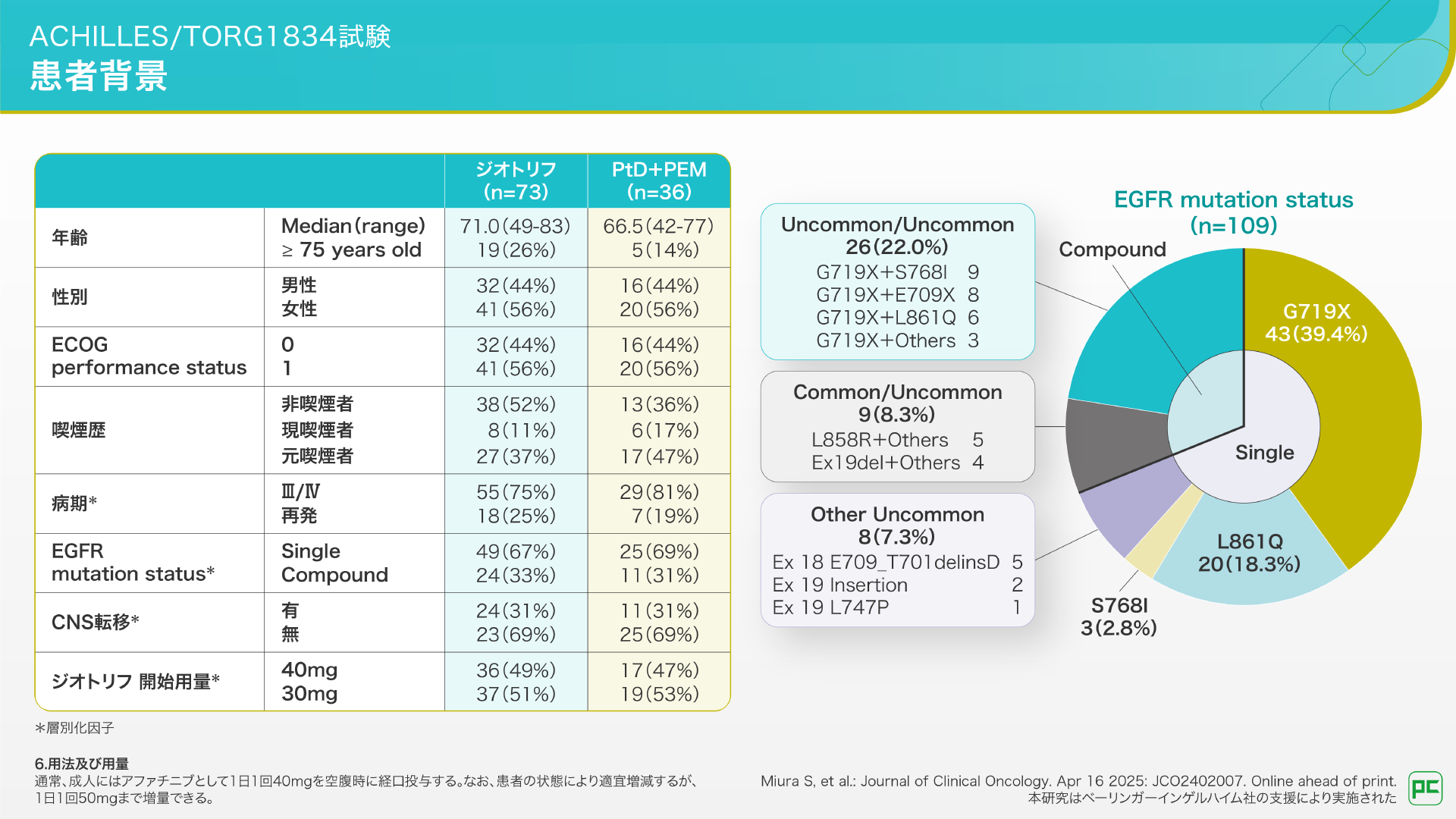 対象には、EGFR-TKIを含む化学療法未治療かつSensitizing uncommon mutation変異を有するNSCLC患者さん109例が含まれました。Sensitizing uncommon mutationとは、in vitroデータなどからジオトリフに感受性があると考えられる変異を意味しており、exon20挿入変異とdenovo T790M変異を除くUncommon/Compound EGFR遺伝子変異を指します。