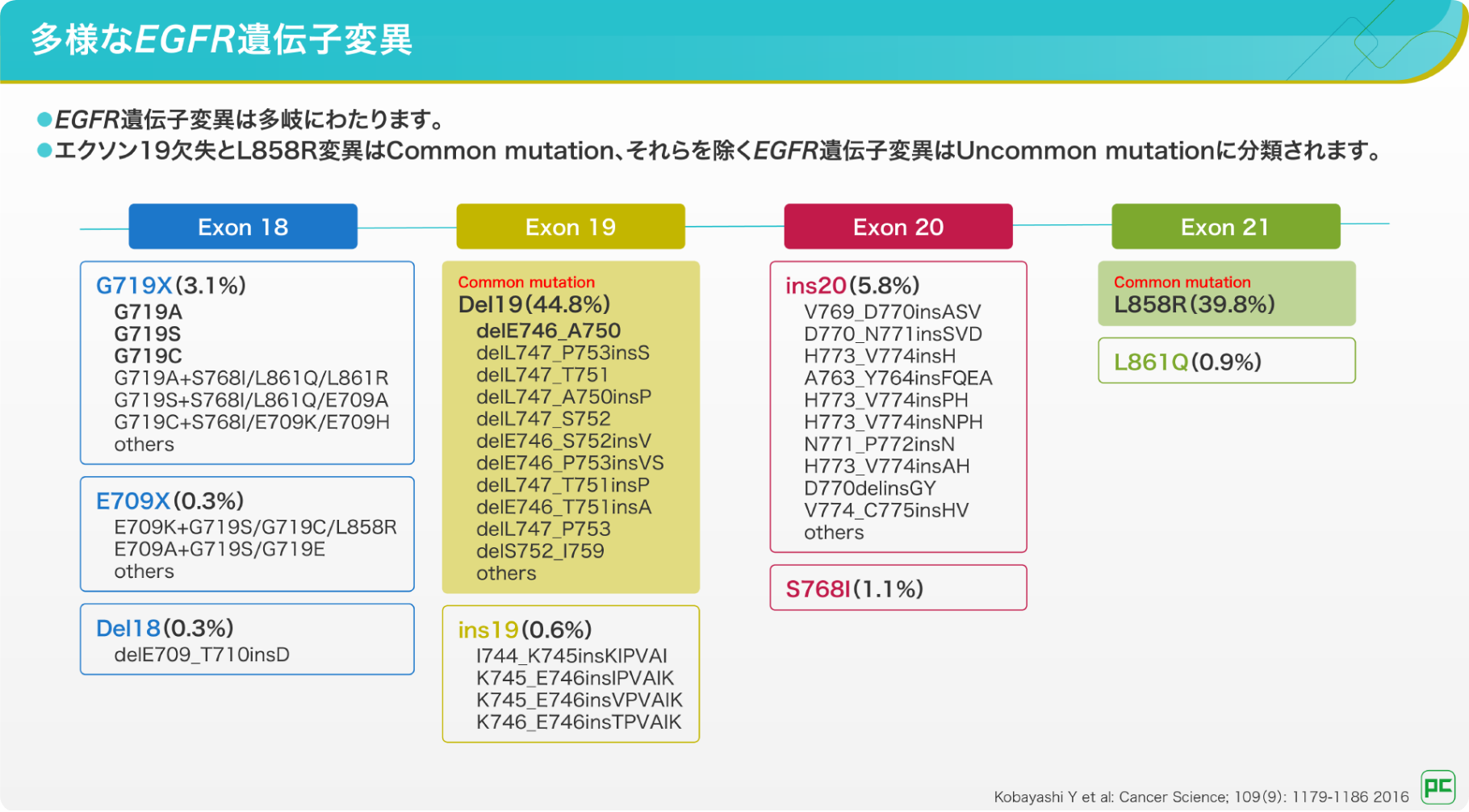 EGFR遺伝子変異には、Common mutation と呼ばれるExon19欠失変異、L858R変異以外に、Uncommon mutationが存在することが従来から知られています。これらの変異の生物学的特性と治療反応性の多様性は、基礎研究で示されてきました1,2)。しかし、最近の臨床研究では、これらがより明確になっています3,4)。