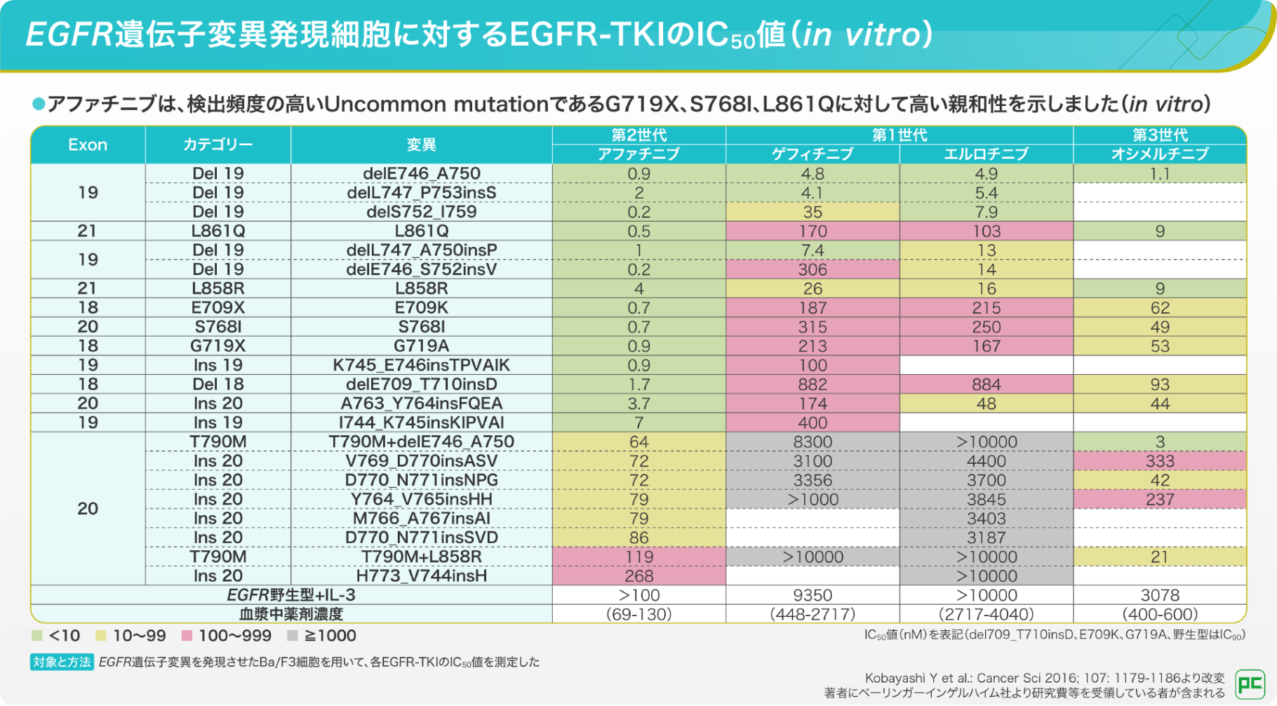 著者にベーリンガーインゲルハイム社よりコンサルタント料等を受領している者が含まれる。 - 日本肺癌学会バイオマーカー委員会編:肺癌患者におけるバイオマーカー検査の手引き(2024 年 9 月改訂版). (付表)各コンパニオン診断法における報告対象バリアント. https://www.haigan.gr.jp/publication/guidance/inspection/(2025年4月アクセス)
