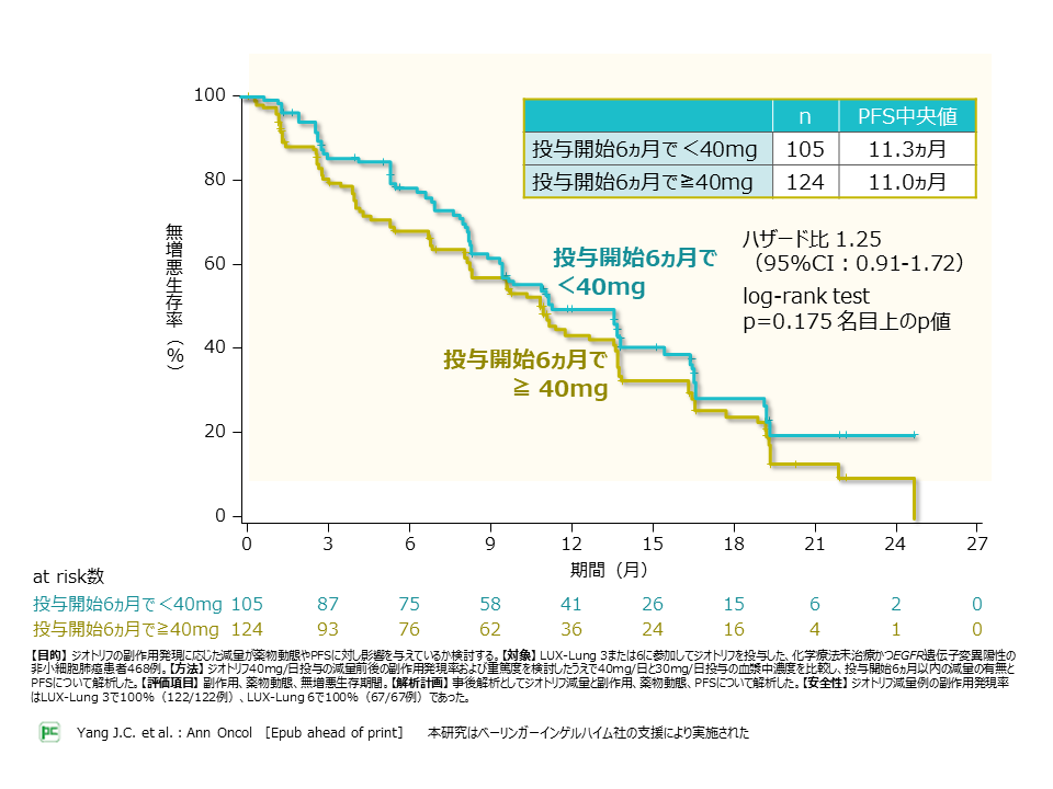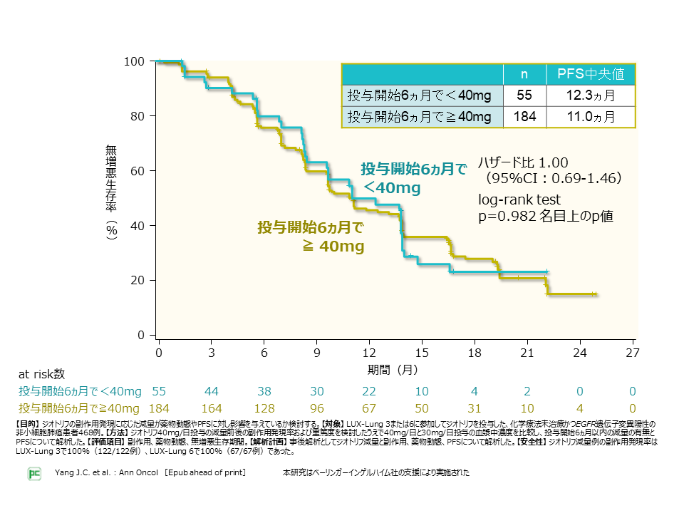 LUX-Lung3,6の統合解析の結果をご紹介します。本解析の対象は、EGFR遺伝子変異陽性非小細胞肺癌患者468例です。ジオトリフ40mg投与開始後6ヵ月以内の減量の有無と減量前後の副作用発現率および重篤度、無増悪生存期間(PFS)について解析を行いました。