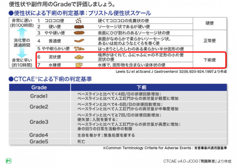 下痢の評価には、便性状によるブリストル便性状スケールや、有害事象共通用語規準であるCTCAEが用いられます。ブリストル便性状スケールでは、泥状便、水様便が下痢便と判定されます。CTCAEはGrade1~5で評価します。