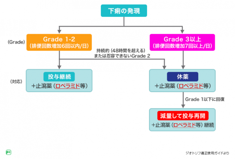 ジオトリフ適正使用ガイドでは、Grade1~2ではロペラミドなどの下痢止めを追加してジオトリフの投与を継続することが推奨されています。一方、Grade3以上またはGrade2の下痢でも48時間を超えるものや忍容できない場合には、ジオトリフを休薬し、下痢止めを投与して症状がGrade1以下に回復した後にジオトリフを減量して投与再開することが推奨されています。