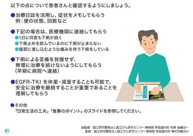 また、休薬・減量、発症時の水分摂取、下痢止め服用の必要性を繰り返し説明してください。ただし、重度の便秘にならないよう下痢止めの過度の服用は避け、下痢や腹痛がひどい場合はすぐに医師へ連絡をしてもらうように説明することも大切です。
