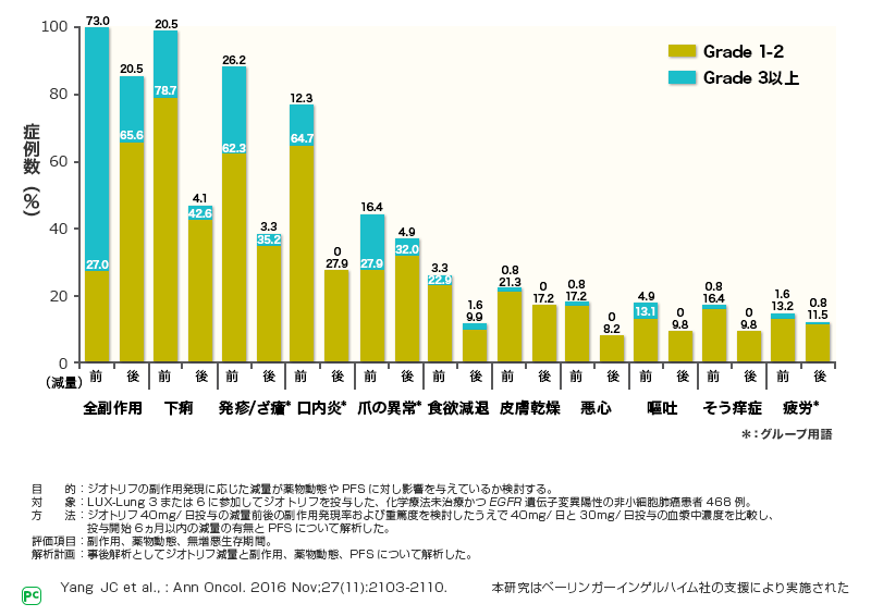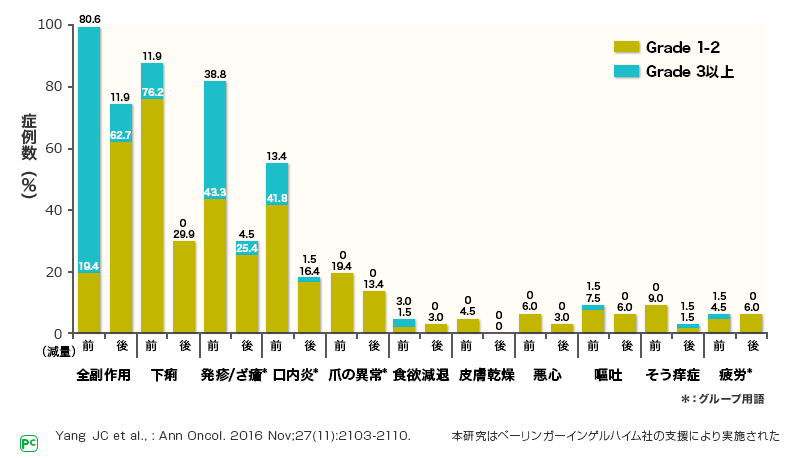 以上の結果から、ジオトリフは用量マネジメントにより、副作用発現頻度を減らし、効果を減弱させず治療を続けることができると考えられます。