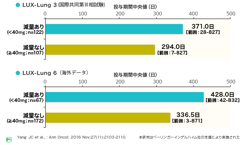 投与期間は、LUX-Lung3,6ともに減量した患者さんで短縮はみられませんでした。