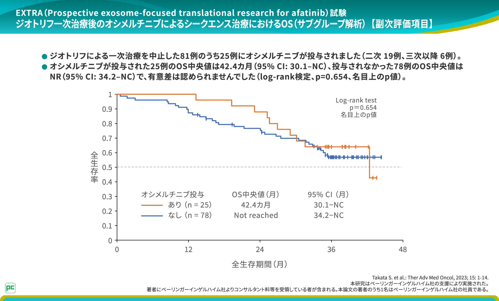 そのため、今回の結果は、一次治療でジオトリフ治療を開始し、その後オシメルチニブ投与を受けた患者さんでのOS中央値は、「少なくとも」 42.4ヵ月と解釈することができる結果だと思っています。