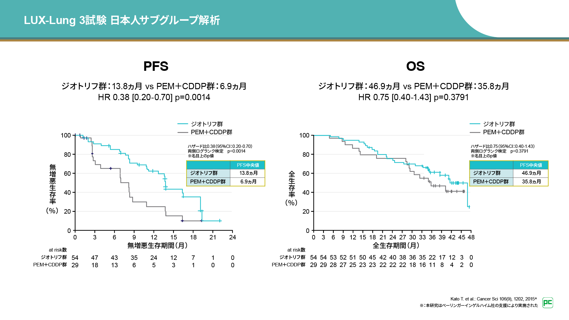 また、日本人サブグループ解析では、PFS中央値はジオトリフ群13.8ヵ月、PEM+CDDP群6.9ヵ月であり、ジオトリフ投与による有意な延長が示されました(両側層別ログランク検定 p=0.0014 名目上のp値)。また、日本人サブグループ解析におけるOS中央値は、ジオトリフ群46.9ヵ月、PEM+CDDP群35.8ヵ月でした。