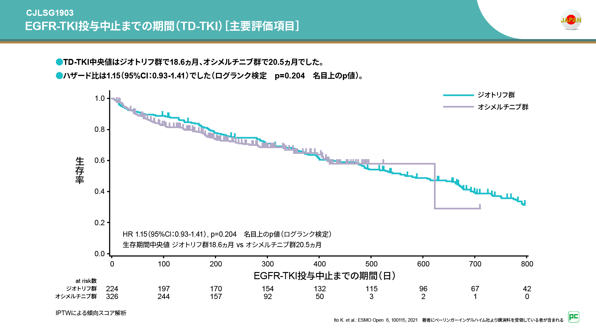 主要評価項目である、EGFR-TKI投与中止までの期間(TD-TKI)の中央値は、ジオトリフ群で18.6ヵ月、オシメルチニブ群で20.5ヵ月であり、ハザード比は1.15でした(ログランク検定 p=0.204 名目上のp値)。