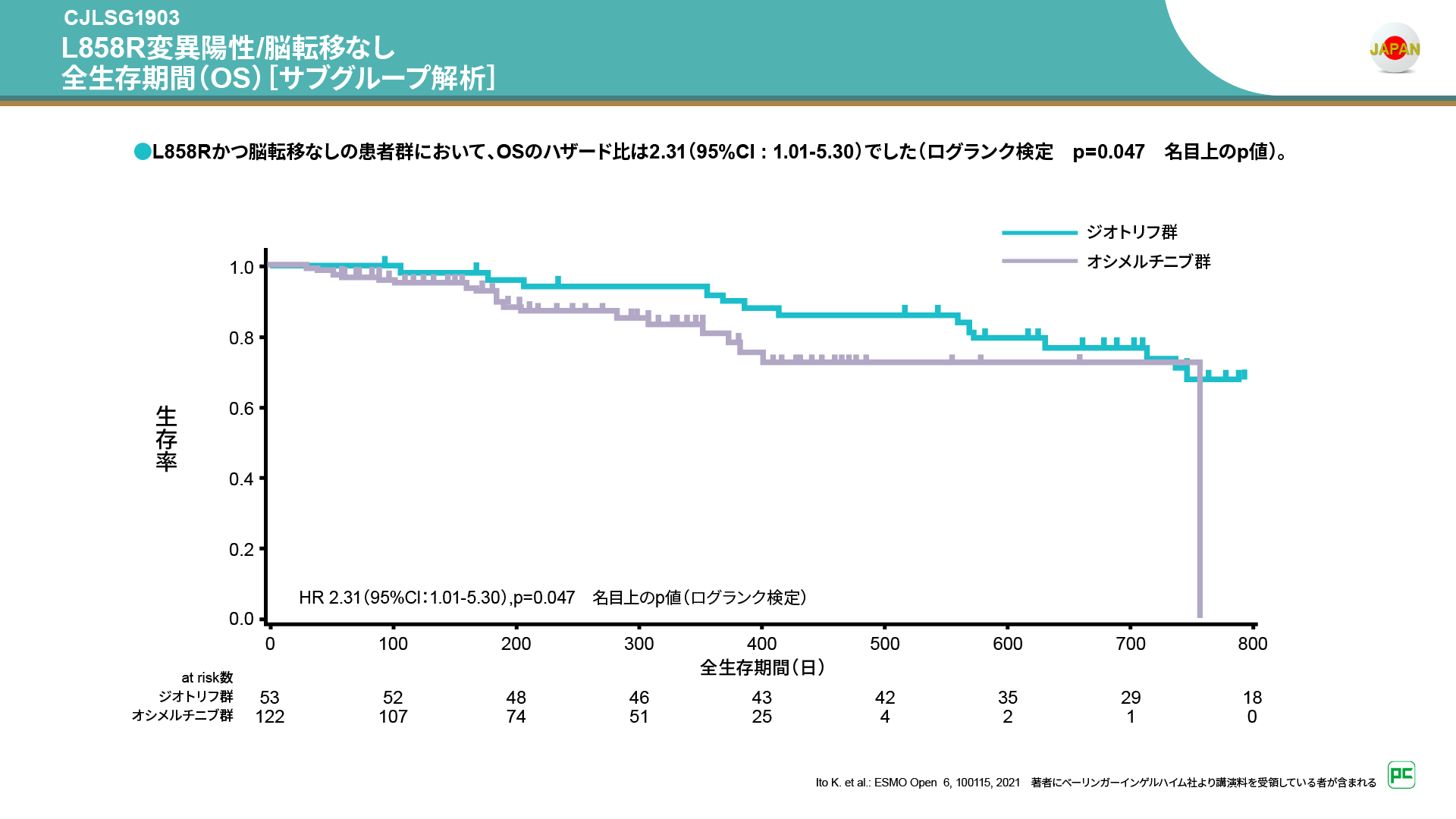 サブグループ解析となるL858R変異陽性かつ脳転移のない患者において、OSはジオトリフ群でより長く、そのハザード比は2.31でした(ログランク検定 p=0.047 名目上のp値)。