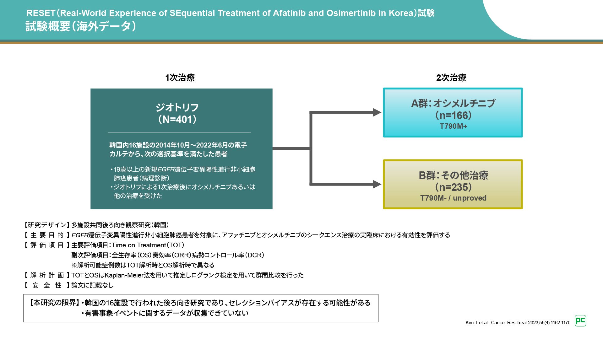 私は、OSの延長を目的とした治療を考える上で、シークエンスを目指す治療は重要な治療選択肢のひとつと考えています。そこで私からは、ジオトリフから開始してシークエンスを目指す治療に関するデータとして、最近報告された韓国のリアルワールドデータ9,10)をご紹介します。