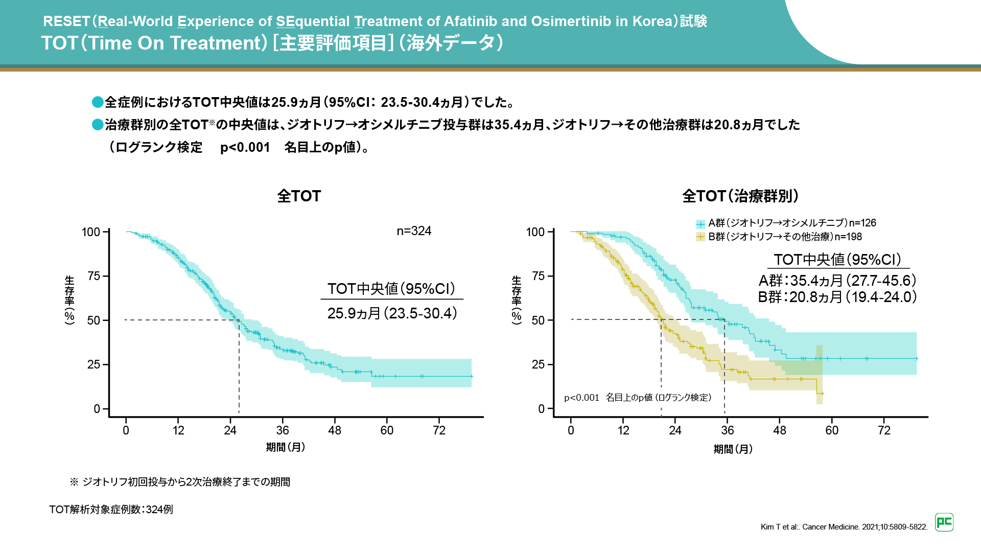 主要評価項目であるTime On Treatment(TOT)の中央値は、全症例で25.9ヵ月であり、ジオトリフ→オシメルチニブ投与群では35.4ヵ月、ジオトリフ→その他治療群では20.8ヵ月でした(ログランク検定 p<0.001 名目上のp値)。