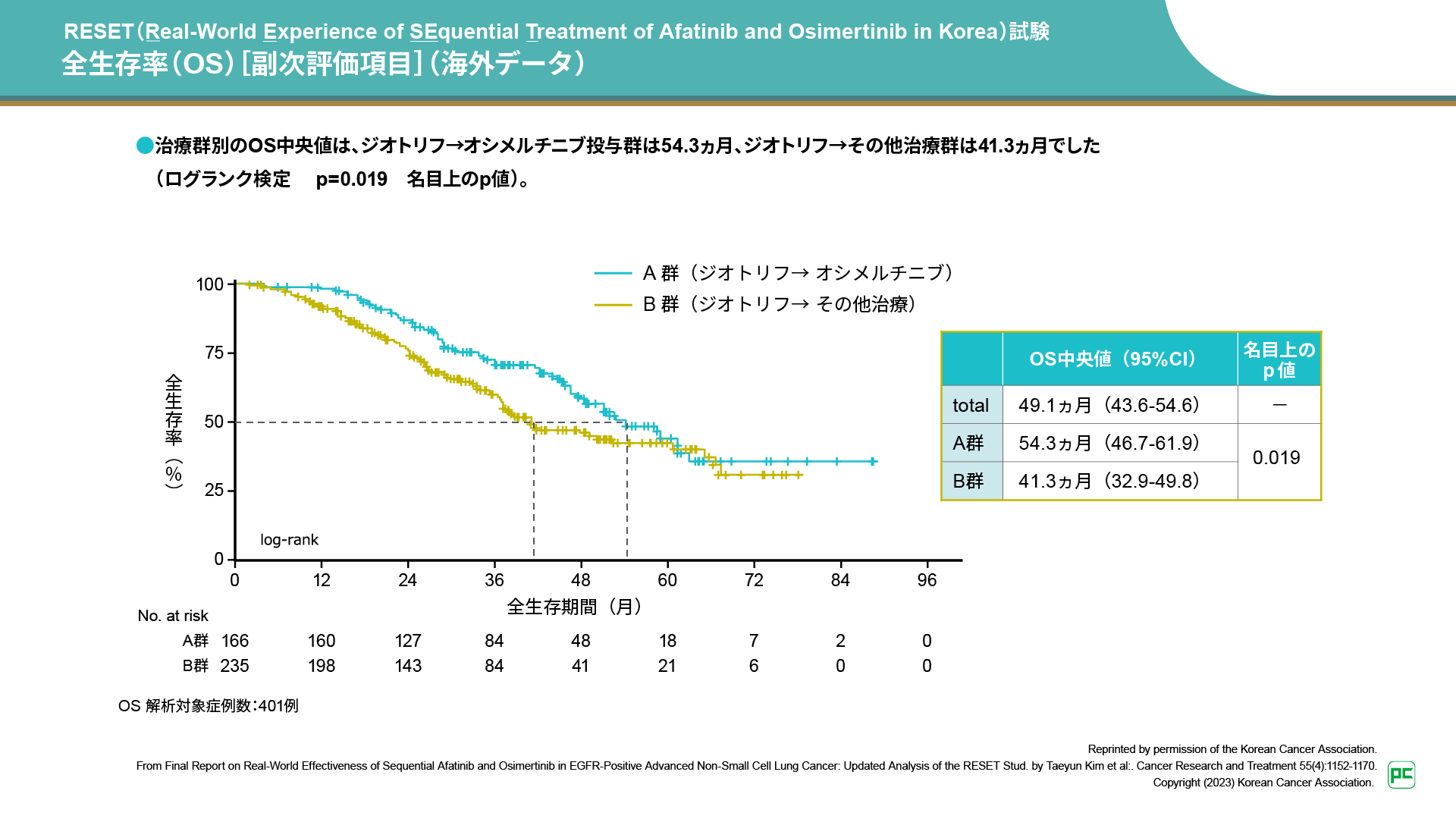 また、OS中央値は、全症例で49.1ヵ月であり、ジオトリフ→オシメルチニブ投与群では54.3ヵ月、ジオトリフ→その他治療群では41.3ヵ月でした(ログランク検定 p=0.019 名目上のp値)。