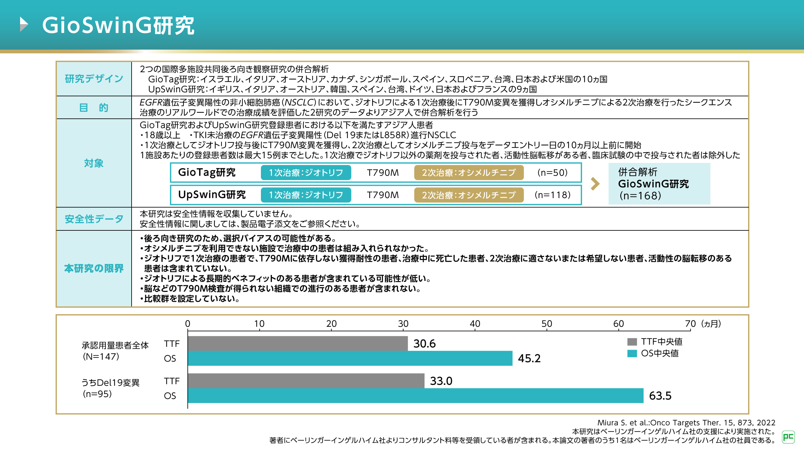 GioSwinG研究は、日本および海外で行われたGioTag研究とUpSwinG研究を併せ、アファチニブによる1次治療後にT790M変異を獲得しオシメルチニブによる2次治療を行った症例について解析したものです(図5)。本研究でのOS中央値は全体で45.2ヵ月、さらにDel19変異においては63.5ヵ月と非常に長いOS中央値が得られています。