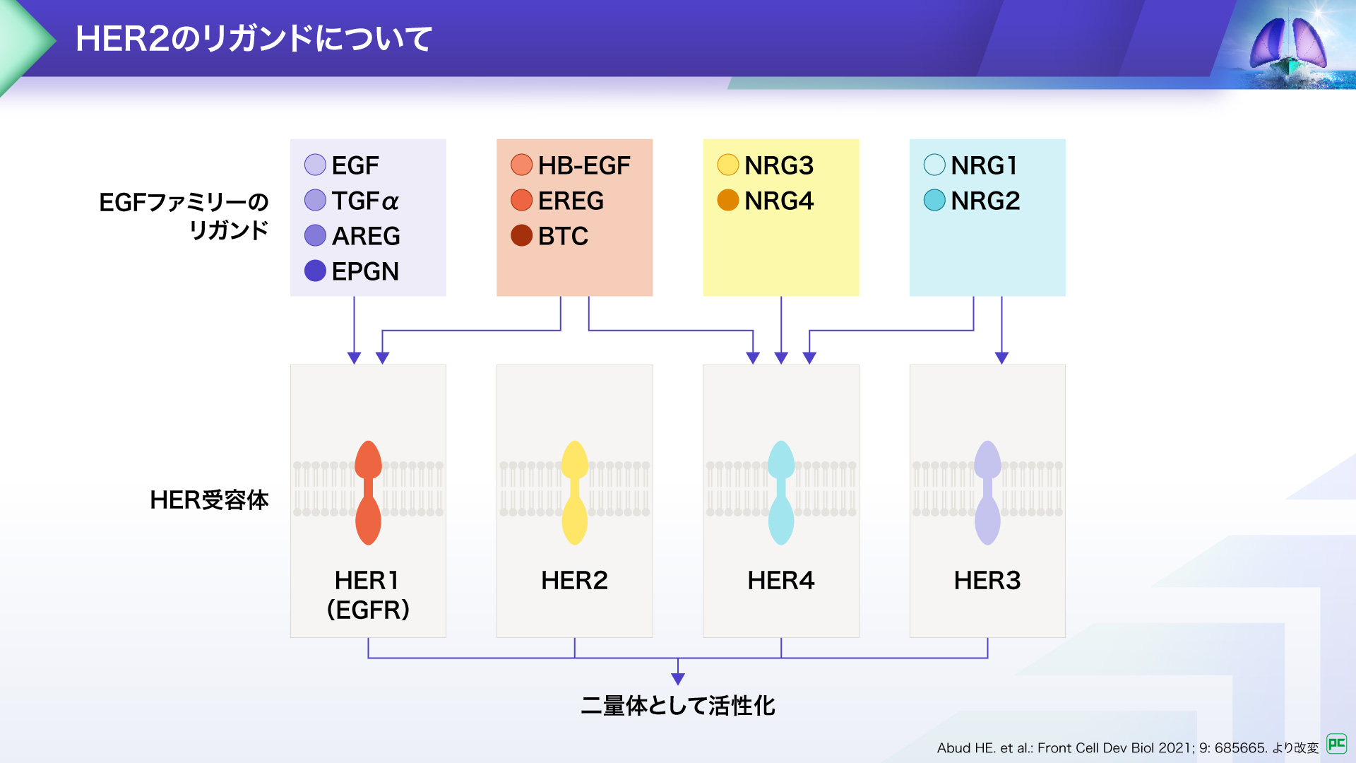 HERファミリーには、HER1(EGFR)、HER2、HER3、HER4の4つの受容体があります。これらは、それぞれ特定のリガンド(結合分⼦)と結合し、⼆量体を形成することで活性化され、細胞の増殖や分化などに関与します。