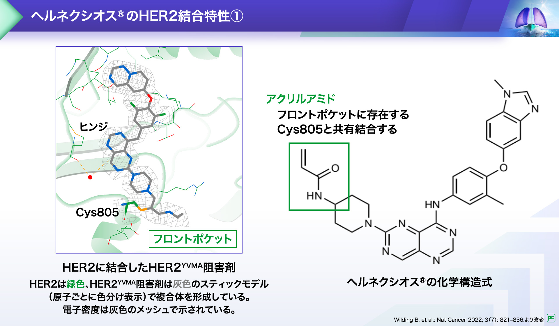 HER2には複数の薬剤結合領域(ポケット)が存在し、薬剤がこれらの領域に正確に結合しなければ、ATPの結合によるキナーゼの活性化を阻害する⼗分な効果を発揮できません。しかし、HER2YVMA変異ではATP結合ポケット周辺の構造が変化するため薬剤の結合が困難でした。