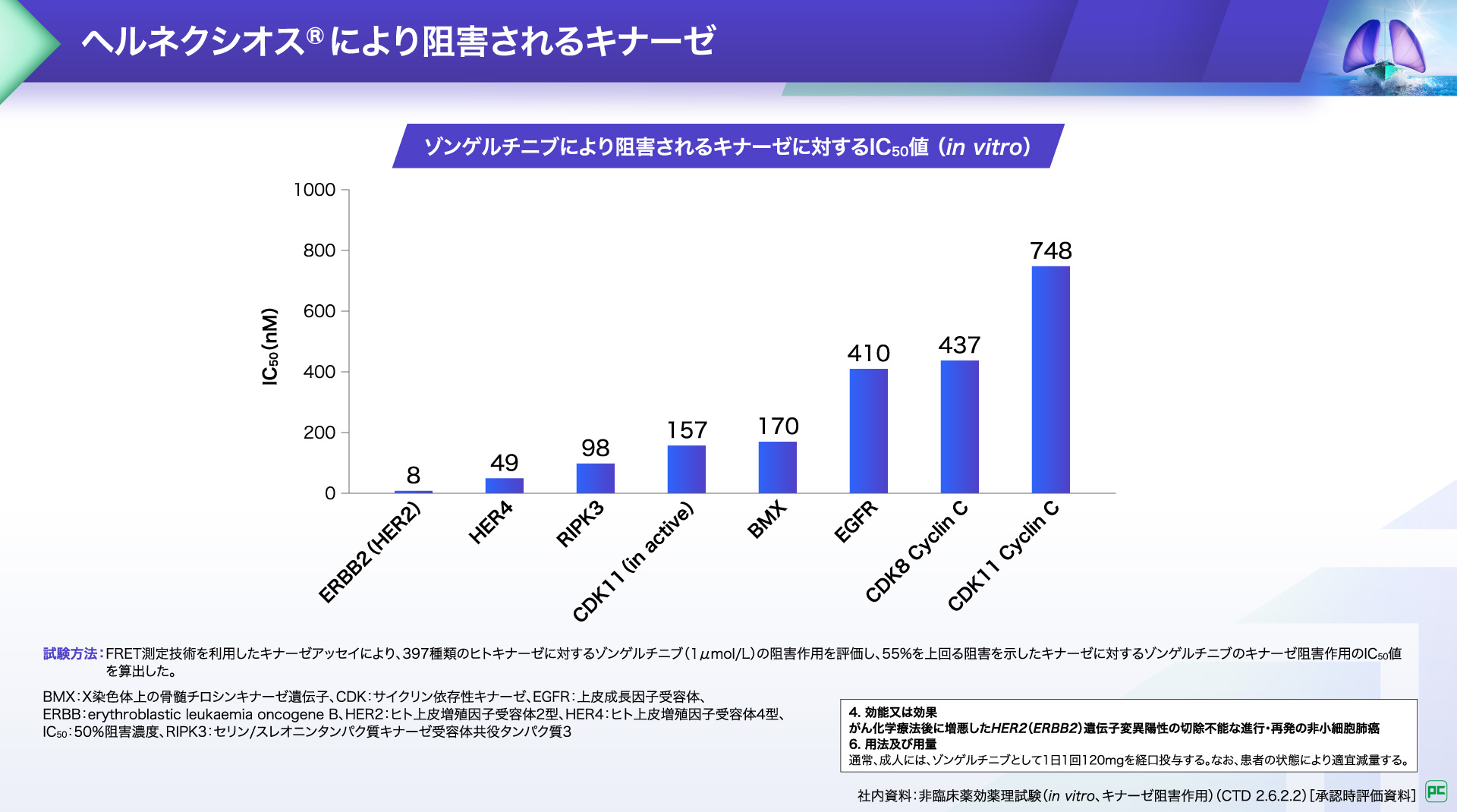 ヘルネクシオス®は、グラフに⽰したEGFRを含む複数のキナーゼの中で、HER2に対して最も低いIC₅₀値を⽰し、他のキナーゼと⽐較し、低濃度処理においてもがん細胞の増殖抑制作⽤が認められました。