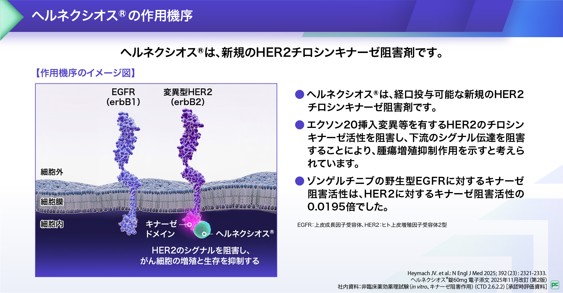 エクソン20挿⼊変異等を有するHER2のチロシンキナーゼ活性を阻害し、下流のシグナル伝達を阻害することにより、腫瘍増殖抑制作⽤を⽰すと考えられています6)。