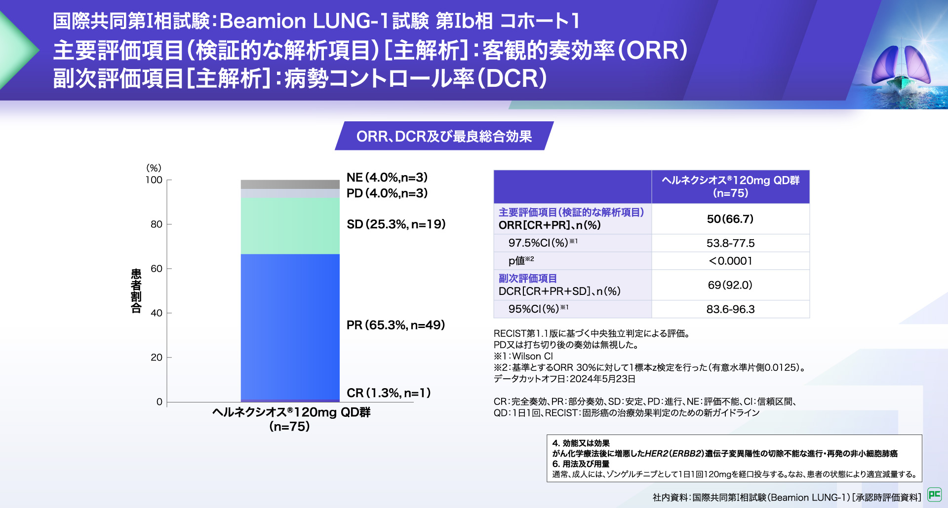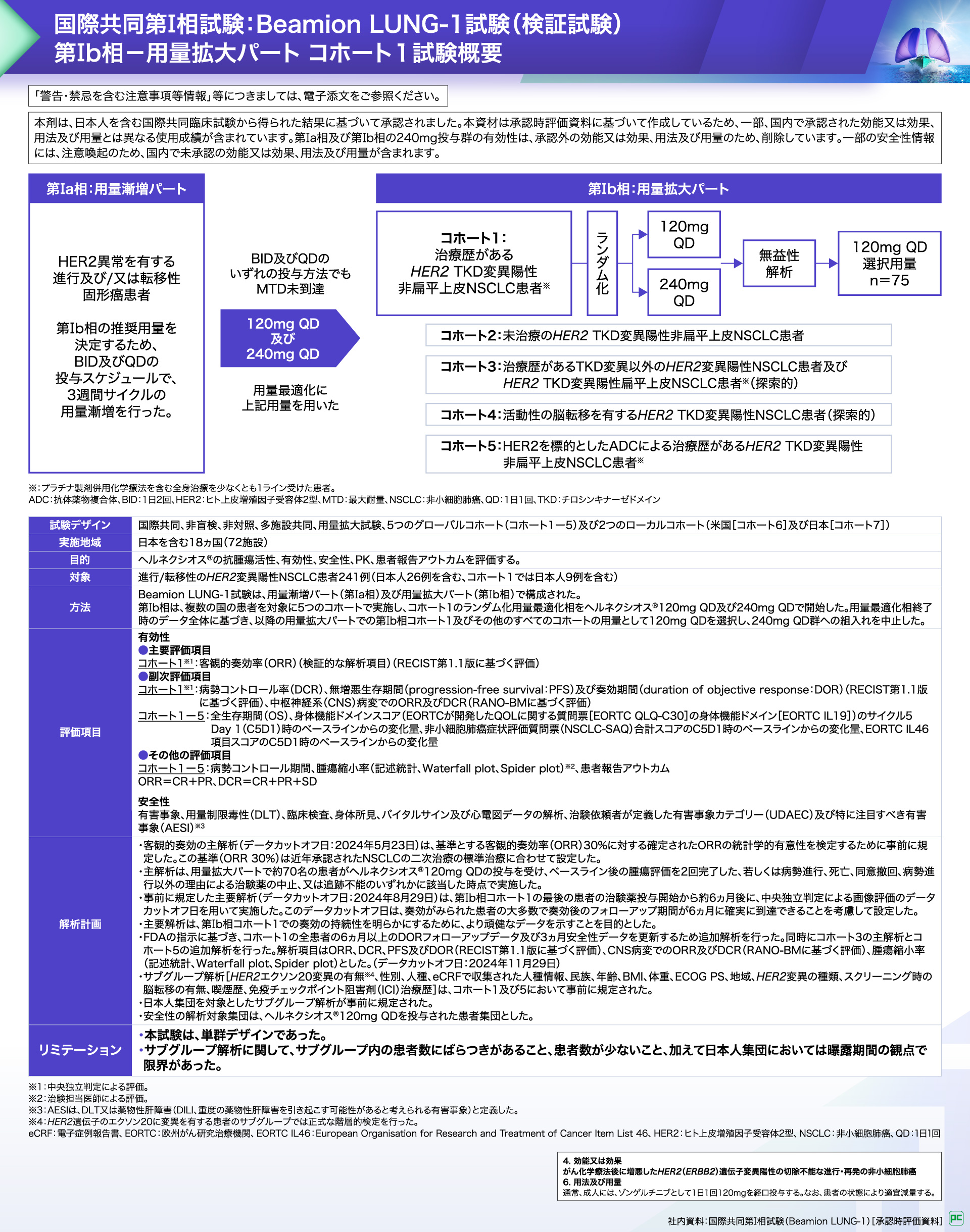 Beamion LUNG-1試験の第Ib相では、進⾏/転移性のHER2変異陽性NSCLC患者を対象に、ヘルネクシオス®の有効性と安全性を評価しました。