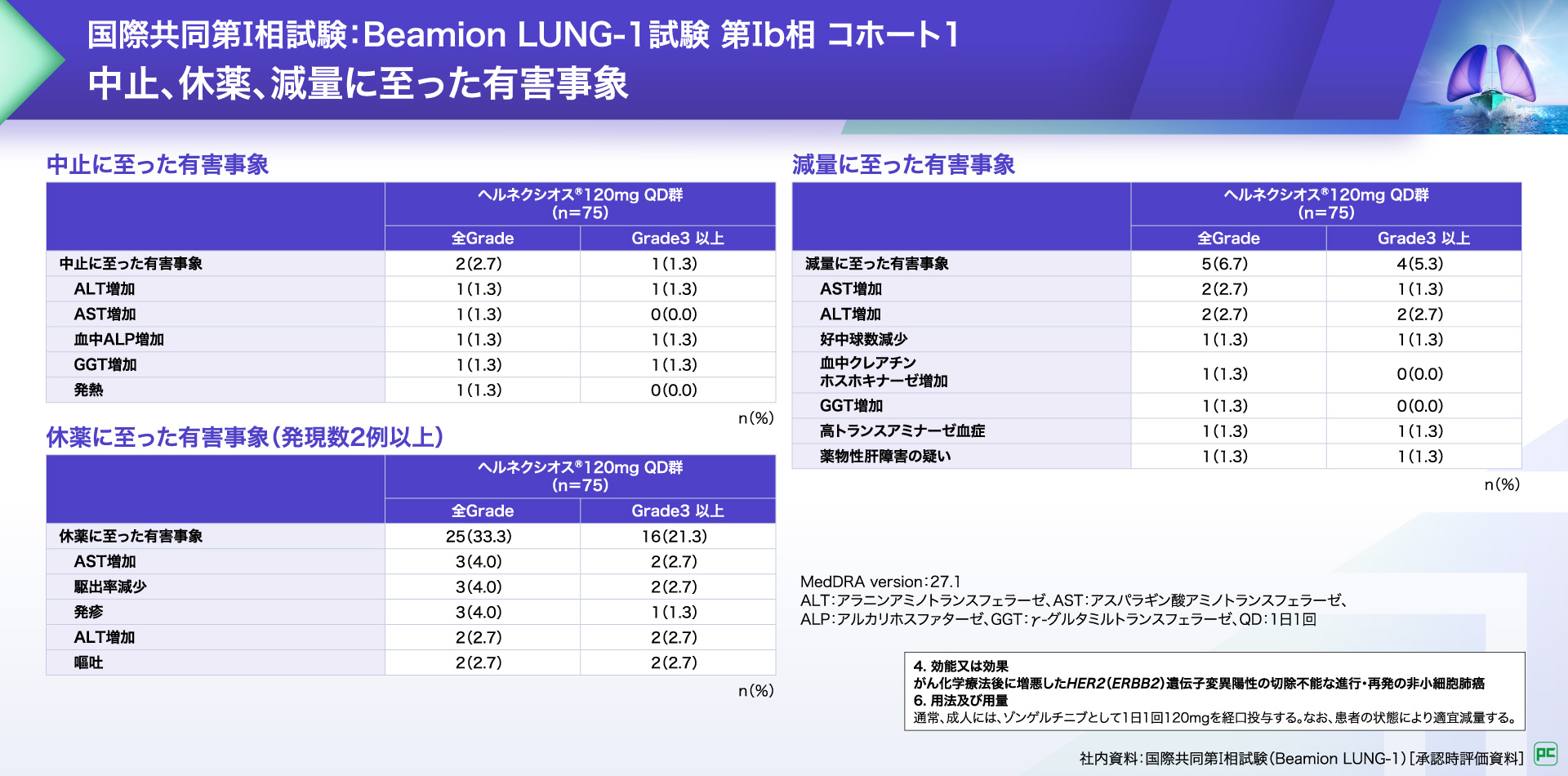 主な有害事象は下痢(54.7%)、AST増加(24.0%)、発疹(22.7%)、ALT増加(21.3%)などでした。