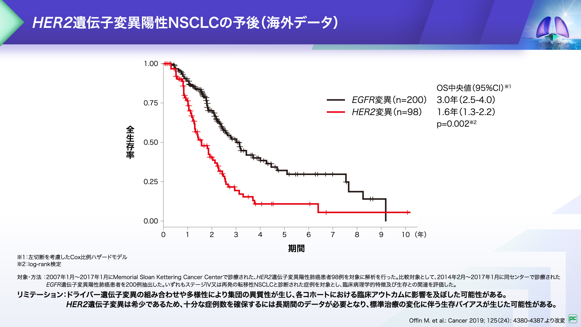 HER2遺伝⼦変異陽性NSCLC患者のOS中央値は1.6年であり、 EGFR遺伝⼦変異陽性NSCLC患者と⽐較して予後不良であることが報告されています。