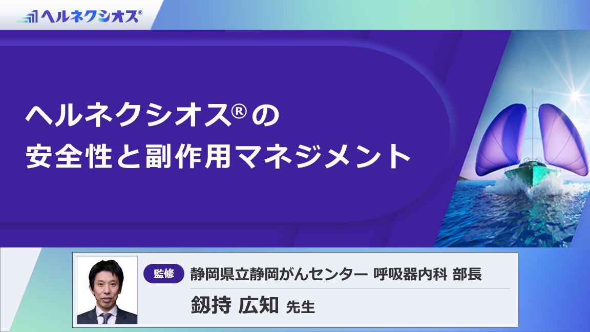 副作⽤は、早期発⾒・早期対応を⾏うことで重症化を予防できることがあります。患者さんのQOLを維持しながら治療を継続し、治療効果を最⼤化させるためにも、医療従事者がヘルネクシオス®の副作⽤マネジメントへの理解を深めることが重要です。