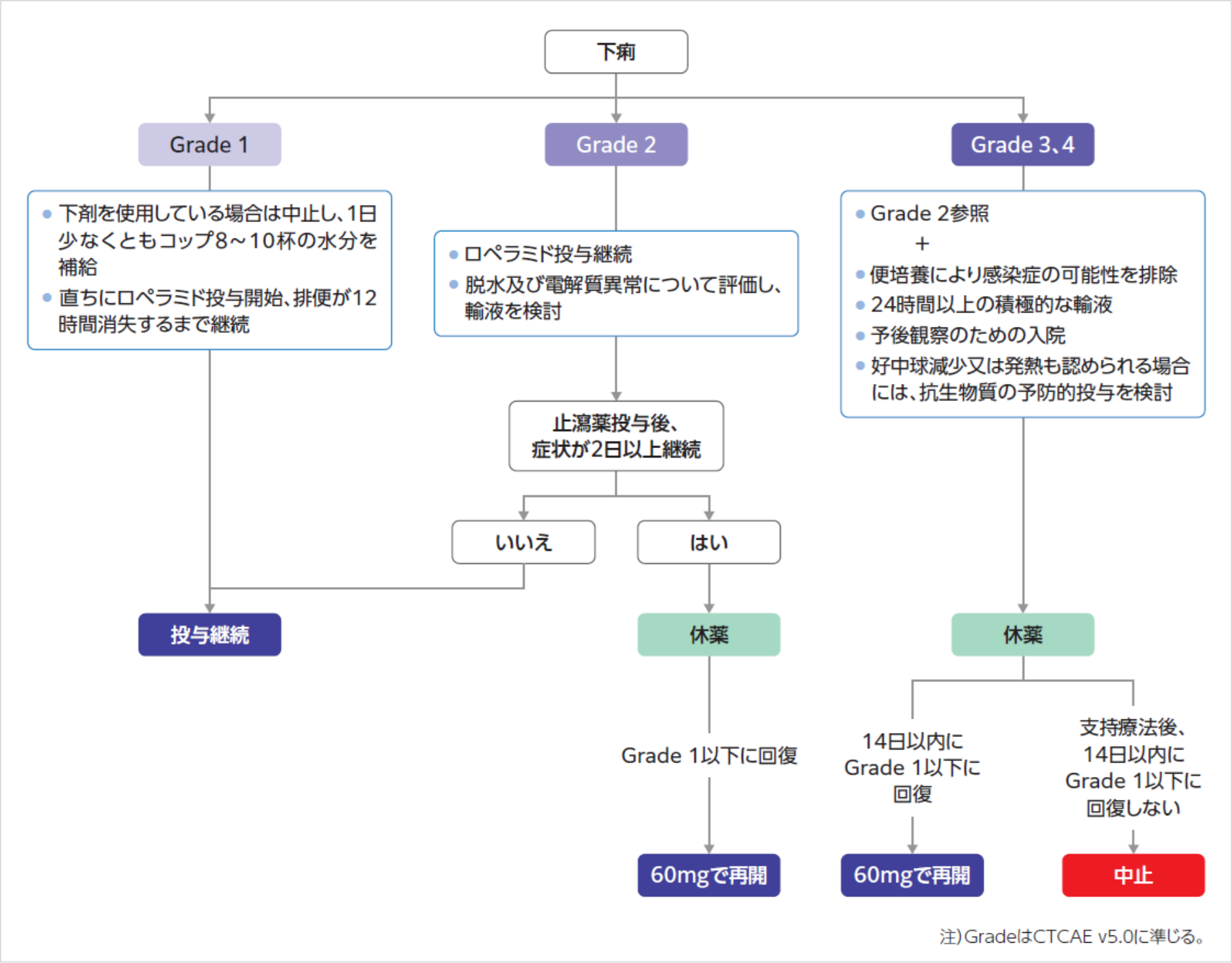 下痢が発現した場合は、Gradeに応じて本剤の投与継続⼜は休薬を判断し、適切な処置を実施してください。