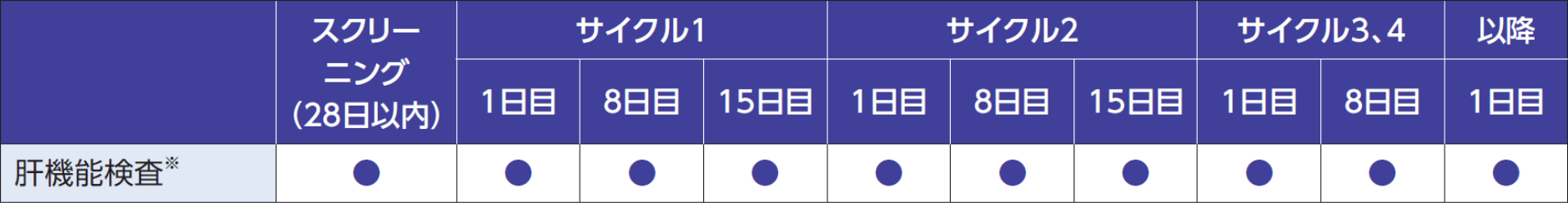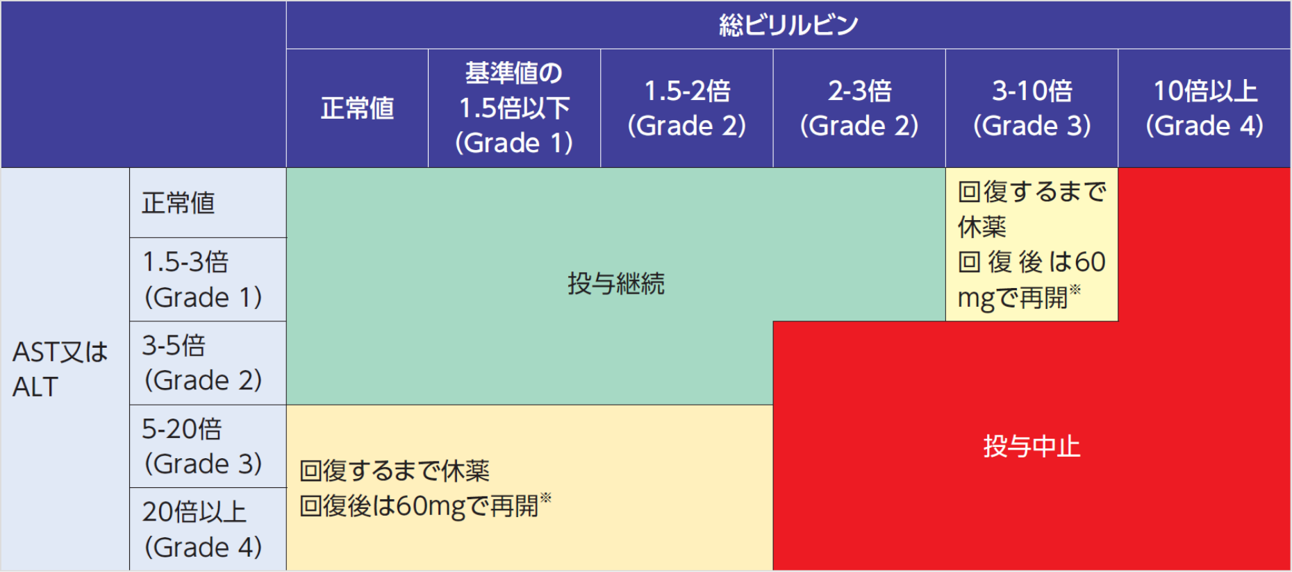 ALT増加、AST増加及び総ビリルビン増加のGradeに応じて本剤の投与継続、休薬⼜は中⽌を判断してください。