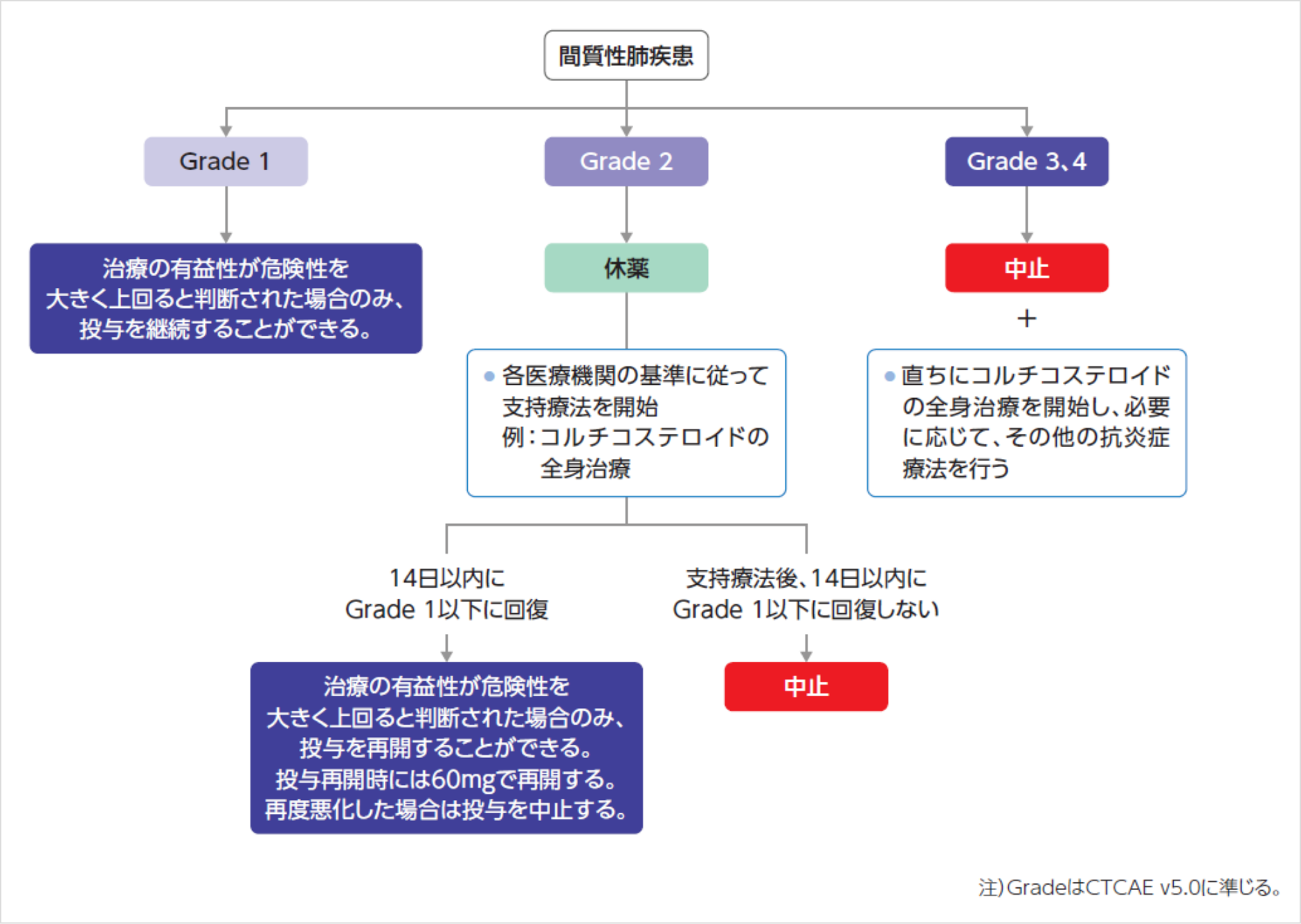 Grade 3⼜は4の間質性肺疾患が発現した場合は、本剤の投与を中⽌してください。