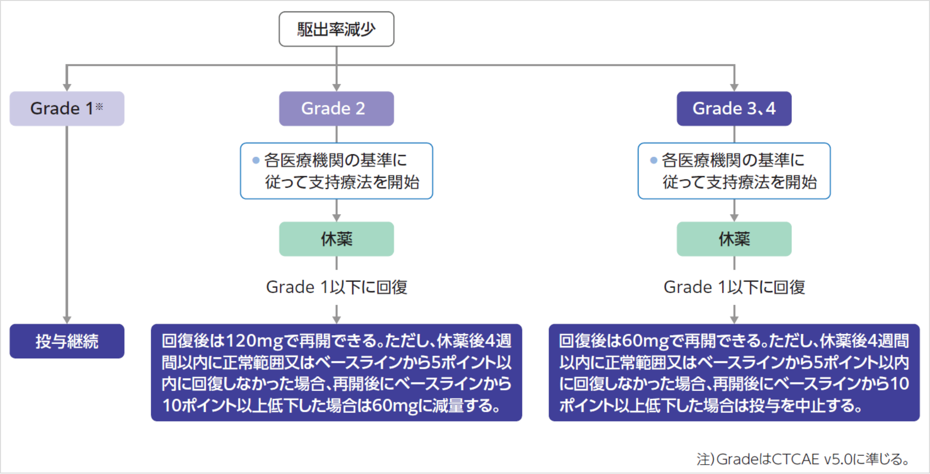 駆出率減少が発現した場合は、Gradeに応じて本剤の投与継続⼜は休薬を判断し、適切な処置を実施してください。