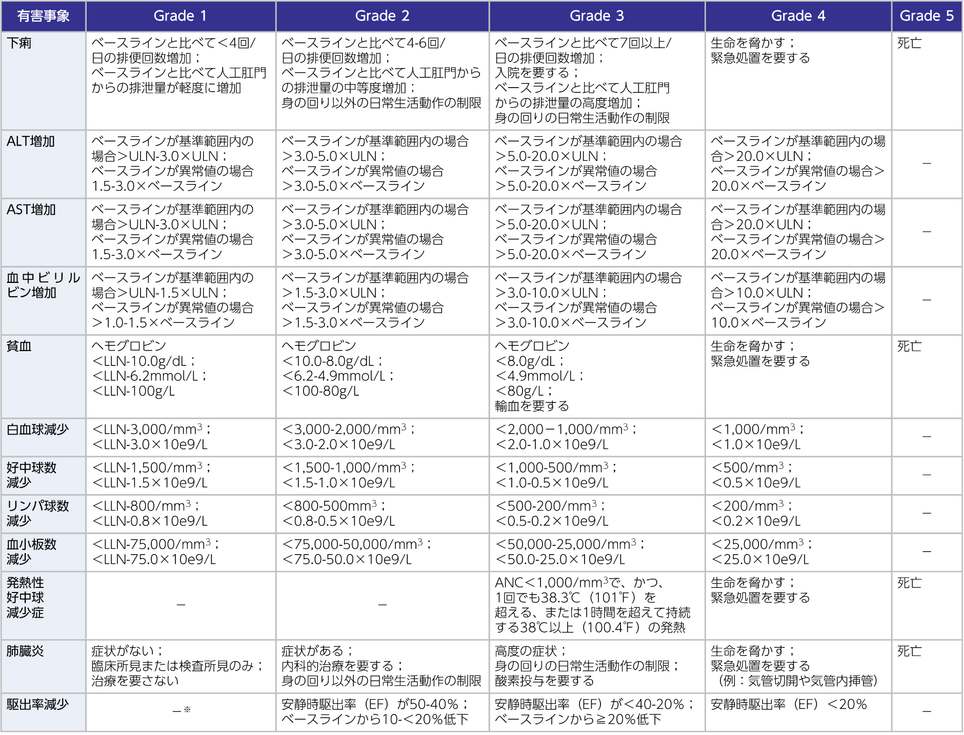Gradeに応じて本剤の投与継続⼜は休薬を慎重に判断し、適切な処置を実施してください。