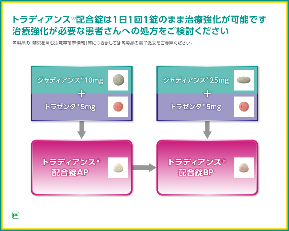 利便性の面では、ジャディアンスは10mg錠と25mg錠での用量調整が可能であり、またDPP-4阻害薬トラゼンタとの合剤であるトラディアンス配合錠をお使いいただけば、1日1回1錠のままで、治療強化が可能です。