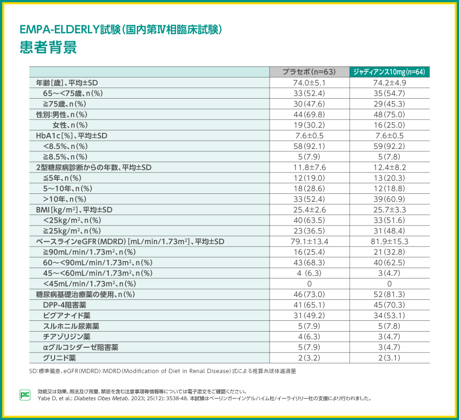 参加者の平均年齢はジャディアンス10mg群で74.2歳、プラセボ群で74.0歳、平均HbA1cは両群とも7.6%でした。平均BMIはジャディアンス10mg群で25.7 kg/m2、プラセボ群で25.4 kg/m2、平均eGFRはそれぞれ81.9 mL/分/1.73m2、79.1 mL/分/1.73m2でした。糖尿病に対する基礎治療としてはDPP-4阻害薬、ビグアナイド薬が多く使用されていました。
