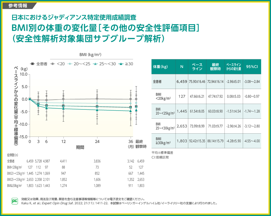 ベースラインから最終観察時までの体重の変化量は全患者では-2.96kg(95%信頼区間:-3.08~-2.84)、BMI<20kg/m2では0.08kg(-0.80~0.97)、20~<25kg/m2では-1.51kg(-1.74~-1.28)、25~<30kg/m2では-2.96kg(-3.12~-2.80)、≧30 kg/m2では-4.28kg(-4.55~-4.00)でした。